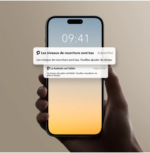 L'application vous avertit rapidement en cas de niveau de nourriture ou batterie faible.