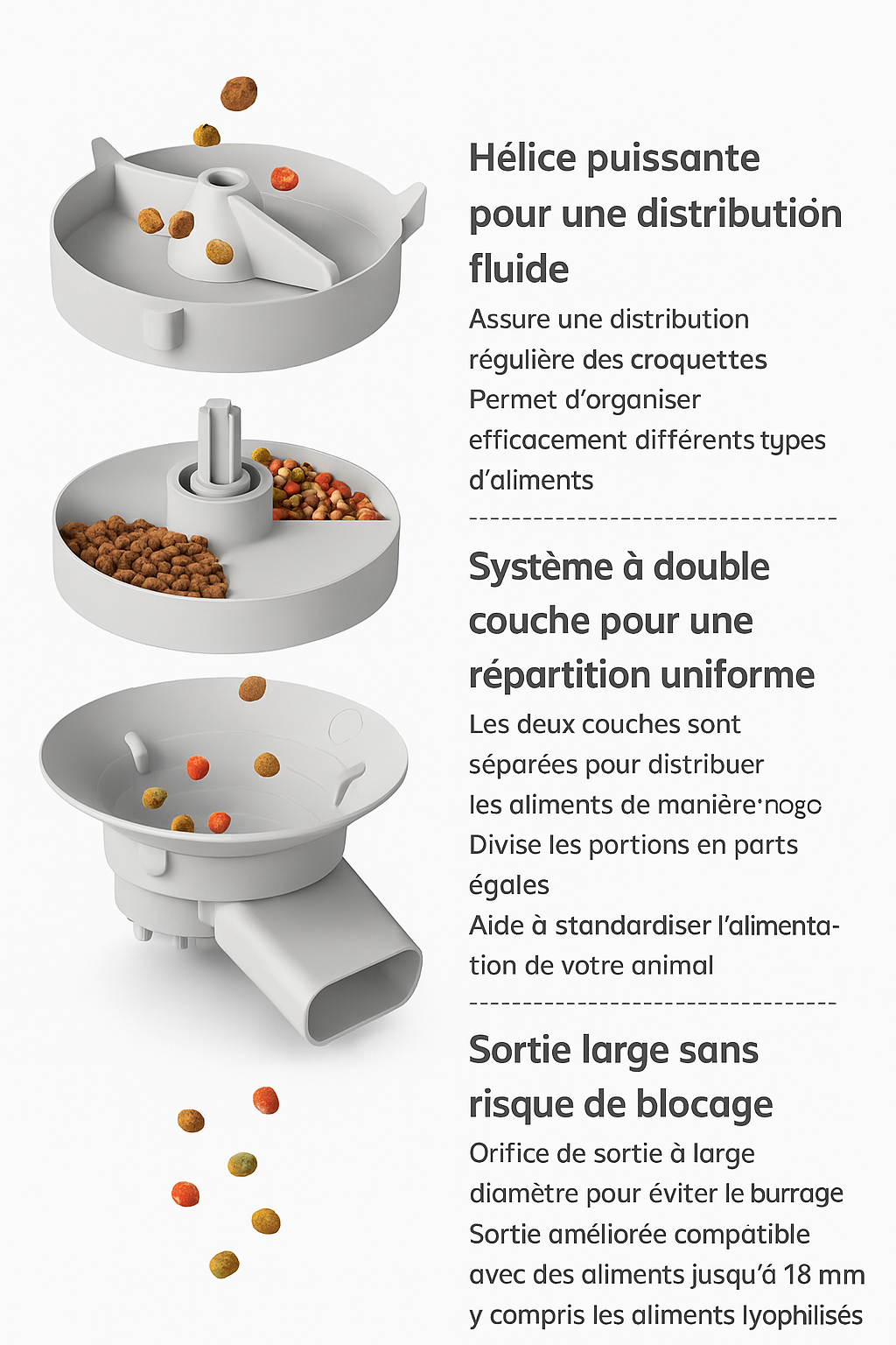 Distributeur fiable, aucune croquette bloquée. Très satisfait.