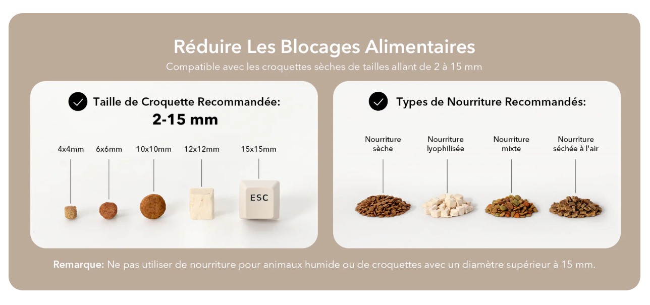 Le Feliney Feed prend en charge les aliments secs et les biscuits multi-grains de moins de 18 mm, offrant une alimentation polyvalente pour répondre aux besoins nutritionnels de votre animal.