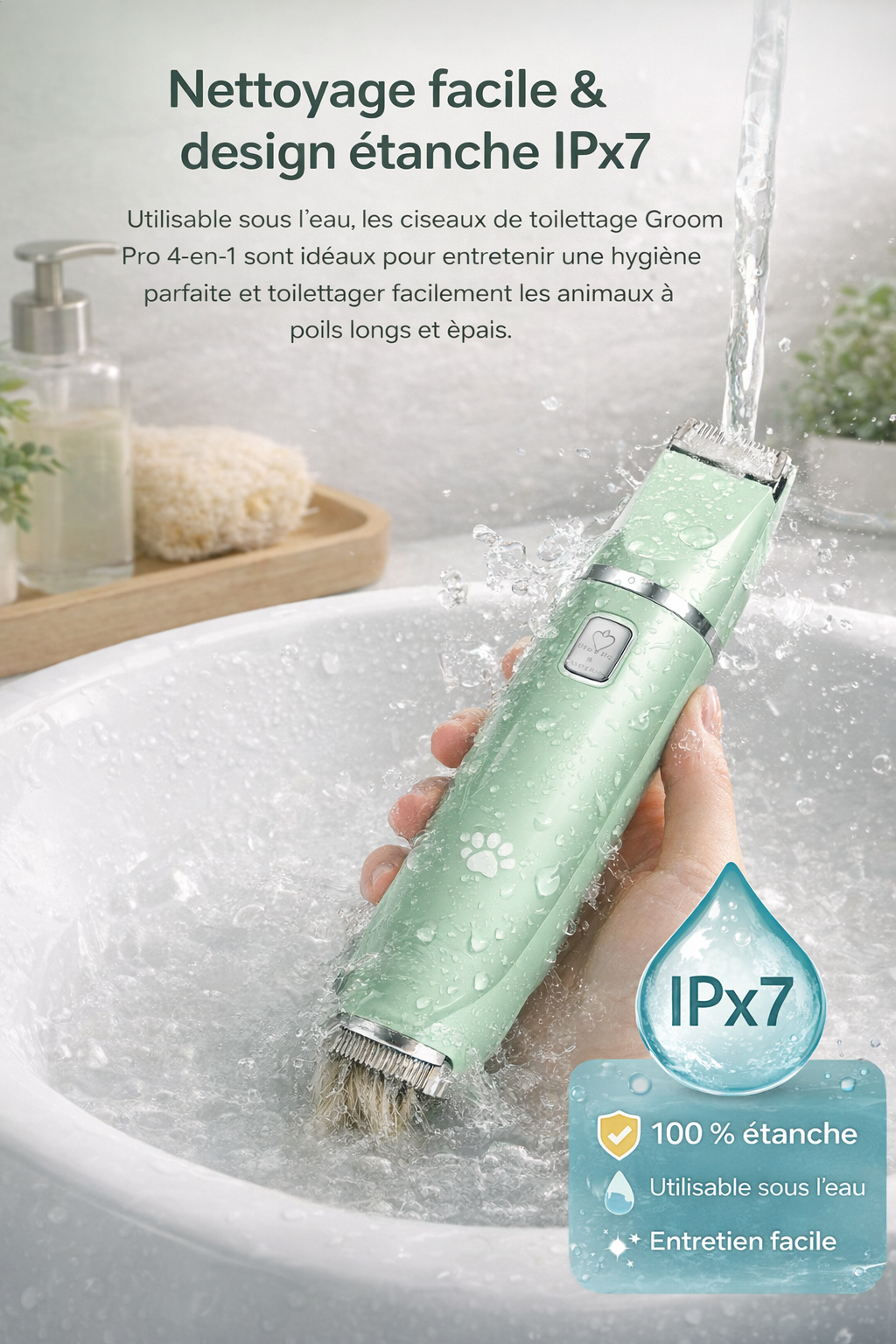 Absolument, les tondeuses pour animaux de compagnie Groom Pro 4-en-1 sont dotées d'un design étanche IPx7. Vous pouvez nettoyer l'ensemble de l'appareil sous l'eau pour un nettoyage pratique. Veillez simplement à utiliser les ciseaux courts pour les poils longs et épais.